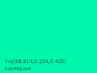 Yxy 68.814,0.254,0.435 Color is a normal green color and the nearest color is Medium Spring Green #00fa9a. Hex code #00f6aa and RGB value is rgb(0,246,170). In RGB color space, this color is composed of 0% red, 96% green, 67% blue, In CMYK color space, this color is composed of 100% cyan, 0% magenta, 31% yellow , 4% black , In HSL color space, this color has a hue angle of 161° , 100% saturation and 48% lightness.