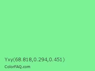 Yxy 68.818,0.294,0.451 Color is a light green color and the nearest color is Light Green #90ee90. Hex code #7cf094 and RGB value is rgb(124,240,148). In RGB color space, this color is composed of 49% red, 94% green, 58% blue, In CMYK color space, this color is composed of 48% cyan, 0% magenta, 38% yellow , 6% black , In HSL color space, this color has a hue angle of 132° , 79% saturation and 71% lightness.