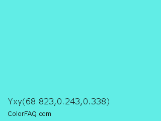 Yxy 68.823,0.243,0.338 Color is a light cyan color and the nearest color is Turquoise Blue #6cdae7. Hex code #61ede6 and RGB value is rgb(97,237,230). In RGB color space, this color is composed of 38% red, 93% green, 90% blue, In CMYK color space, this color is composed of 59% cyan, 0% magenta, 3% yellow , 7% black , In HSL color space, this color has a hue angle of 177° , 80% saturation and 65% lightness.