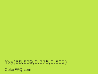 Yxy 68.839,0.375,0.502 Color is a normal lime color and the nearest color is June Bud #bdda57. Hex code #c0e749 and RGB value is rgb(192,231,73). In RGB color space, this color is composed of 75% red, 91% green, 29% blue, In CMYK color space, this color is composed of 17% cyan, 0% magenta, 68% yellow , 9% black , In HSL color space, this color has a hue angle of 75° , 77% saturation and 60% lightness.