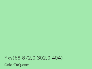 Yxy 68.872,0.302,0.404 Color is a light green color and the nearest color is Teal Deer #99e6b3. Hex code #a2e9ad and RGB value is rgb(162,233,173). In RGB color space, this color is composed of 64% red, 91% green, 68% blue, In CMYK color space, this color is composed of 30% cyan, 0% magenta, 26% yellow , 9% black , In HSL color space, this color has a hue angle of 129° , 62% saturation and 77% lightness.
