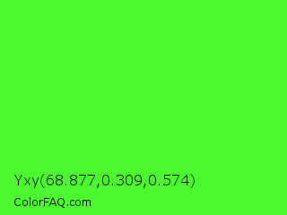 Yxy 68.877,0.309,0.574 Color is a normal green color and the nearest color is Neon Green #39ff14. Hex code #4cf82f and RGB value is rgb(76,248,47). In RGB color space, this color is composed of 30% red, 97% green, 18% blue, In CMYK color space, this color is composed of 69% cyan, 0% magenta, 81% yellow , 3% black , In HSL color space, this color has a hue angle of 111° , 93% saturation and 58% lightness.