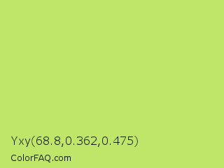 Yxy 68.8,0.362,0.475 Color is a light lime color and the nearest color is Inchworm #b2ec5d. Hex code #bfe668 and RGB value is rgb(191,230,104). In RGB color space, this color is composed of 75% red, 90% green, 41% blue, In CMYK color space, this color is composed of 17% cyan, 0% magenta, 55% yellow , 10% black , In HSL color space, this color has a hue angle of 79° , 72% saturation and 65% lightness.