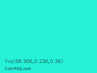 Yxy 68.906,0.236,0.36 Color is a normal cyan color and the nearest color is Bright Turquoise #08e8de. Hex code #26f2da and RGB value is rgb(38,242,218). In RGB color space, this color is composed of 15% red, 95% green, 85% blue, In CMYK color space, this color is composed of 84% cyan, 0% magenta, 10% yellow , 5% black , In HSL color space, this color has a hue angle of 173° , 89% saturation and 55% lightness.