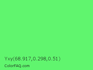 Yxy 68.917,0.298,0.51 Color is a light green color and the nearest color is Screamin Green #66ff66. Hex code #60f56e and RGB value is rgb(96,245,110). In RGB color space, this color is composed of 38% red, 96% green, 43% blue, In CMYK color space, this color is composed of 61% cyan, 0% magenta, 55% yellow , 4% black , In HSL color space, this color has a hue angle of 126° , 88% saturation and 67% lightness.