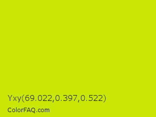Yxy 69.022,0.397,0.522 Color is a normal yellow color and the nearest color is Bitter Lemon #cae00d. Hex code #c9e605 and RGB value is rgb(201,230,5). In RGB color space, this color is composed of 79% red, 90% green, 2% blue, In CMYK color space, this color is composed of 13% cyan, 0% magenta, 98% yellow , 10% black , In HSL color space, this color has a hue angle of 68° , 96% saturation and 46% lightness.