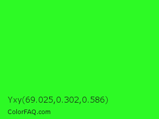Yxy 69.025,0.302,0.586 Color is a normal green color and the nearest color is Neon Green #39ff14. Hex code #2dfa25 and RGB value is rgb(45,250,37). In RGB color space, this color is composed of 18% red, 98% green, 15% blue, In CMYK color space, this color is composed of 82% cyan, 0% magenta, 85% yellow , 2% black , In HSL color space, this color has a hue angle of 118° , 96% saturation and 56% lightness.