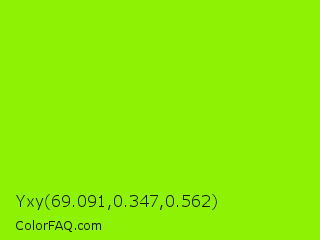 Yxy 69.091,0.347,0.562 Color is a normal green color and the nearest color is Chartreuse #7fff00. Hex code #8df203 and RGB value is rgb(141,242,3). In RGB color space, this color is composed of 55% red, 95% green, 1% blue, In CMYK color space, this color is composed of 42% cyan, 0% magenta, 99% yellow , 5% black , In HSL color space, this color has a hue angle of 85° , 98% saturation and 48% lightness.