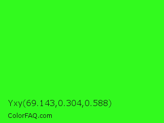 Yxy 69.143,0.304,0.588 Color is a normal green color and the nearest color is Neon Green #39ff14. Hex code #32fa1e and RGB value is rgb(50,250,30). In RGB color space, this color is composed of 20% red, 98% green, 12% blue, In CMYK color space, this color is composed of 80% cyan, 0% magenta, 88% yellow , 2% black , In HSL color space, this color has a hue angle of 115° , 96% saturation and 55% lightness.