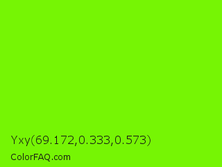 Yxy 69.172,0.333,0.573 Color is a normal green color and the nearest color is Lawn Green #7cfc00. Hex code #76f504 and RGB value is rgb(118,245,4). In RGB color space, this color is composed of 46% red, 96% green, 2% blue, In CMYK color space, this color is composed of 52% cyan, 0% magenta, 98% yellow , 4% black , In HSL color space, this color has a hue angle of 92° , 97% saturation and 49% lightness.