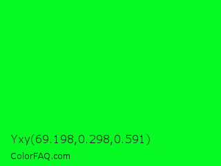 Yxy 69.198,0.298,0.591 Color is a normal green color and the nearest color is Green #00ff00. Hex code #07fb22 and RGB value is rgb(7,251,34). In RGB color space, this color is composed of 3% red, 98% green, 13% blue, In CMYK color space, this color is composed of 97% cyan, 0% magenta, 86% yellow , 2% black , In HSL color space, this color has a hue angle of 127° , 97% saturation and 51% lightness.
