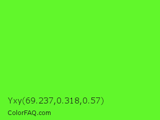 Yxy 69.237,0.318,0.57 Color is a normal green color and the nearest color is Spring Frost #87ff2a. Hex code #61f72b and RGB value is rgb(97,247,43). In RGB color space, this color is composed of 38% red, 97% green, 17% blue, In CMYK color space, this color is composed of 61% cyan, 0% magenta, 83% yellow , 3% black , In HSL color space, this color has a hue angle of 104° , 93% saturation and 57% lightness.