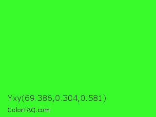 Yxy 69.386,0.304,0.581 Color is a normal green color and the nearest color is Neon Green #39ff14. Hex code #39fa2b and RGB value is rgb(57,250,43). In RGB color space, this color is composed of 22% red, 98% green, 17% blue, In CMYK color space, this color is composed of 77% cyan, 0% magenta, 83% yellow , 2% black , In HSL color space, this color has a hue angle of 116° , 95% saturation and 57% lightness.