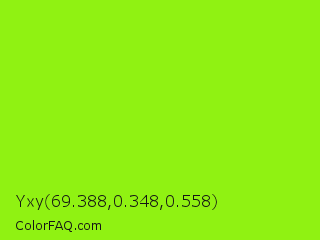Yxy 69.388,0.348,0.558 Color is a normal green color and the nearest color is Chartreuse #7fff00. Hex code #90f212 and RGB value is rgb(144,242,18). In RGB color space, this color is composed of 56% red, 95% green, 7% blue, In CMYK color space, this color is composed of 40% cyan, 0% magenta, 93% yellow , 5% black , In HSL color space, this color has a hue angle of 86° , 90% saturation and 51% lightness.