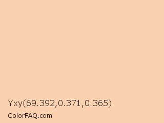 Yxy 69.392,0.371,0.365 Color is a very light orange color and the nearest color is Apricot Peach #fbceb1. Hex code #fbd1af and RGB value is rgb(251,209,175). In RGB color space, this color is composed of 98% red, 82% green, 69% blue, In CMYK color space, this color is composed of 0% cyan, 17% magenta, 30% yellow , 2% black , In HSL color space, this color has a hue angle of 27° , 90% saturation and 84% lightness.