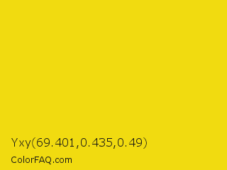 Yxy 69.401,0.435,0.49 Color is a normal yellow color and the nearest color is Ripe Lemon #f4d81c. Hex code #f1db10 and RGB value is rgb(241,219,16). In RGB color space, this color is composed of 95% red, 86% green, 6% blue, In CMYK color space, this color is composed of 0% cyan, 9% magenta, 93% yellow , 5% black , In HSL color space, this color has a hue angle of 54° , 89% saturation and 50% lightness.