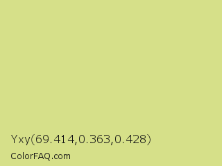 Yxy 69.414,0.363,0.428 Color is a light yellow color and the nearest color is Medium Spring Bud #c9dc87. Hex code #d6e089 and RGB value is rgb(214,224,137). In RGB color space, this color is composed of 84% red, 88% green, 54% blue, In CMYK color space, this color is composed of 4% cyan, 0% magenta, 39% yellow , 12% black , In HSL color space, this color has a hue angle of 67° , 58% saturation and 71% lightness.