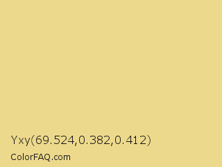 Yxy 69.524,0.382,0.412 Color is a light yellow color and the nearest color is Wild Rice #ece090. Hex code #edd98c and RGB value is rgb(237,217,140). In RGB color space, this color is composed of 93% red, 85% green, 55% blue, In CMYK color space, this color is composed of 0% cyan, 8% magenta, 41% yellow , 7% black , In HSL color space, this color has a hue angle of 48° , 73% saturation and 74% lightness.