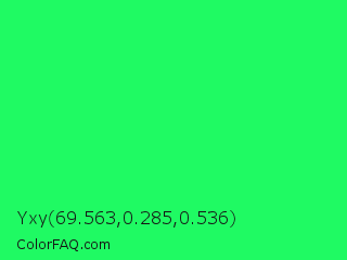 Yxy 69.563,0.285,0.536 Color is a normal green color and the nearest color is Malachite #0bda51. Hex code #1ffa63 and RGB value is rgb(31,250,99). In RGB color space, this color is composed of 12% red, 98% green, 39% blue, In CMYK color space, this color is composed of 88% cyan, 0% magenta, 60% yellow , 2% black , In HSL color space, this color has a hue angle of 139° , 96% saturation and 55% lightness.