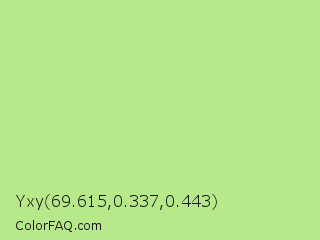 Yxy 69.615,0.337,0.443 Color is a light green color and the nearest color is Sulu #c1f07c. Hex code #b7e88a and RGB value is rgb(183,232,138). In RGB color space, this color is composed of 72% red, 91% green, 54% blue, In CMYK color space, this color is composed of 21% cyan, 0% magenta, 41% yellow , 9% black , In HSL color space, this color has a hue angle of 91° , 67% saturation and 73% lightness.