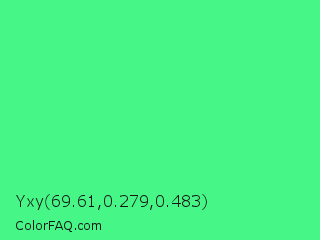 Yxy 69.61,0.279,0.483 Color is a light green color and the nearest color is Very Light Malachite Green #64e986. Hex code #46f787 and RGB value is rgb(70,247,135). In RGB color space, this color is composed of 27% red, 97% green, 53% blue, In CMYK color space, this color is composed of 72% cyan, 0% magenta, 45% yellow , 3% black , In HSL color space, this color has a hue angle of 142° , 92% saturation and 62% lightness.