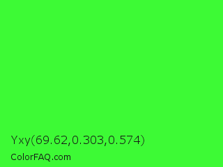 Yxy 69.62,0.303,0.574 Color is a normal green color and the nearest color is Neon Green #39ff14. Hex code #3dfa35 and RGB value is rgb(61,250,53). In RGB color space, this color is composed of 24% red, 98% green, 21% blue, In CMYK color space, this color is composed of 76% cyan, 0% magenta, 79% yellow , 2% black , In HSL color space, this color has a hue angle of 118° , 95% saturation and 59% lightness.