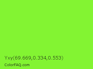 Yxy 69.669,0.334,0.553 Color is a normal green color and the nearest color is Spring Frost #87ff2a. Hex code #82f432 and RGB value is rgb(130,244,50). In RGB color space, this color is composed of 51% red, 96% green, 20% blue, In CMYK color space, this color is composed of 47% cyan, 0% magenta, 80% yellow , 4% black , In HSL color space, this color has a hue angle of 95° , 90% saturation and 58% lightness.