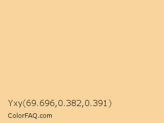 Yxy 69.696,0.382,0.391 Color is a light orange color and the nearest color is New Orleans #f3d69d. Hex code #f7d59a and RGB value is rgb(247,213,154). In RGB color space, this color is composed of 97% red, 84% green, 60% blue, In CMYK color space, this color is composed of 0% cyan, 14% magenta, 38% yellow , 3% black , In HSL color space, this color has a hue angle of 38° , 85% saturation and 79% lightness.