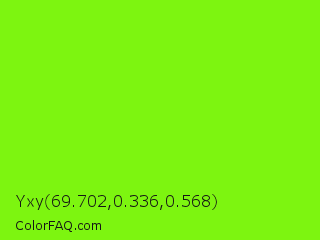 Yxy 69.702,0.336,0.568 Color is a normal green color and the nearest color is Lawn Green #7cfc00. Hex code #7df510 and RGB value is rgb(125,245,16). In RGB color space, this color is composed of 49% red, 96% green, 6% blue, In CMYK color space, this color is composed of 49% cyan, 0% magenta, 93% yellow , 4% black , In HSL color space, this color has a hue angle of 91° , 92% saturation and 51% lightness.