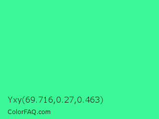 Yxy 69.716,0.27,0.463 Color is a normal green color and the nearest color is Eucalyptus #44d7a8. Hex code #3cf796 and RGB value is rgb(60,247,150). In RGB color space, this color is composed of 24% red, 97% green, 59% blue, In CMYK color space, this color is composed of 76% cyan, 0% magenta, 39% yellow , 3% black , In HSL color space, this color has a hue angle of 149° , 92% saturation and 60% lightness.