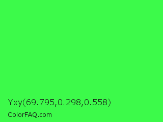 Yxy 69.795,0.298,0.558 Color is a light green color and the nearest color is Screamin Green #66ff66. Hex code #3cfa4a and RGB value is rgb(60,250,74). In RGB color space, this color is composed of 24% red, 98% green, 29% blue, In CMYK color space, this color is composed of 76% cyan, 0% magenta, 70% yellow , 2% black , In HSL color space, this color has a hue angle of 124° , 95% saturation and 61% lightness.