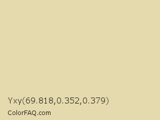 Yxy 69.818,0.352,0.379 Color is a light yellow color and the nearest color is Hampton #e5d8af. Hex code #e5daad and RGB value is rgb(229,218,173). In RGB color space, this color is composed of 90% red, 85% green, 68% blue, In CMYK color space, this color is composed of 0% cyan, 5% magenta, 24% yellow , 10% black , In HSL color space, this color has a hue angle of 48° , 52% saturation and 79% lightness.