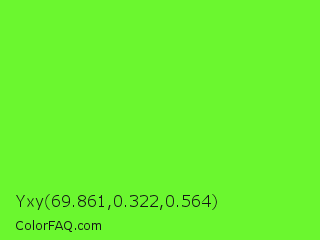 Yxy 69.861,0.322,0.564 Color is a normal green color and the nearest color is Spring Frost #87ff2a. Hex code #6bf72f and RGB value is rgb(107,247,47). In RGB color space, this color is composed of 42% red, 97% green, 18% blue, In CMYK color space, this color is composed of 57% cyan, 0% magenta, 81% yellow , 3% black , In HSL color space, this color has a hue angle of 102° , 93% saturation and 58% lightness.