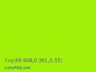 Yxy 69.908,0.361,0.55 Color is a normal green color and the nearest color is Spring Bud #a7fc00. Hex code #a1f008 and RGB value is rgb(161,240,8). In RGB color space, this color is composed of 63% red, 94% green, 3% blue, In CMYK color space, this color is composed of 33% cyan, 0% magenta, 97% yellow , 6% black , In HSL color space, this color has a hue angle of 80° , 94% saturation and 49% lightness.