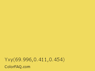 Yxy 69.996,0.411,0.454 Color is a light yellow color and the nearest color is Energy Yellow #f8dd5c. Hex code #f0db5e and RGB value is rgb(240,219,94). In RGB color space, this color is composed of 94% red, 86% green, 37% blue, In CMYK color space, this color is composed of 0% cyan, 9% magenta, 61% yellow , 6% black , In HSL color space, this color has a hue angle of 51° , 83% saturation and 65% lightness.