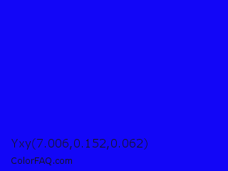 Yxy 7.006,0.152,0.062 Color is a normal indigo color and the nearest color is Blue #0000ff. Hex code #1206f7 and RGB value is rgb(18,6,247). In RGB color space, this color is composed of 7% red, 2% green, 97% blue, In CMYK color space, this color is composed of 93% cyan, 98% magenta, 0% yellow , 3% black , In HSL color space, this color has a hue angle of 243° , 95% saturation and 50% lightness.