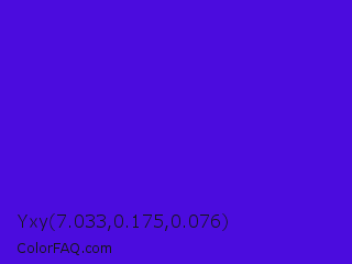 Yxy 7.033,0.175,0.076 Color is a normal indigo color and the nearest color is Interdimensional Blue #360ccc. Hex code #4b0cde and RGB value is rgb(75,12,222). In RGB color space, this color is composed of 29% red, 5% green, 87% blue, In CMYK color space, this color is composed of 66% cyan, 95% magenta, 0% yellow , 13% black , In HSL color space, this color has a hue angle of 258° , 90% saturation and 46% lightness.