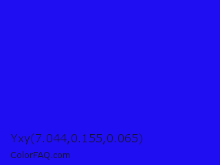 Yxy 7.044,0.155,0.065 Color is a normal indigo color and the nearest color is Bluebonnet #1c1cf0. Hex code #200ef2 and RGB value is rgb(32,14,242). In RGB color space, this color is composed of 13% red, 5% green, 95% blue, In CMYK color space, this color is composed of 87% cyan, 94% magenta, 0% yellow , 5% black , In HSL color space, this color has a hue angle of 245° , 90% saturation and 50% lightness.