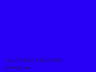Yxy 7.044,0.156,0.063 Color is a normal indigo color and the nearest color is Electric Ultramarine #3f00ff. Hex code #2800f6 and RGB value is rgb(40,0,246). In RGB color space, this color is composed of 16% red, 0% green, 96% blue, In CMYK color space, this color is composed of 84% cyan, 100% magenta, 0% yellow , 4% black , In HSL color space, this color has a hue angle of 250° , 100% saturation and 48% lightness.