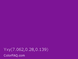 Yxy 7.062,0.28,0.139 Color is a normal purple color and the nearest color is Seance #731e8f. Hex code #7d1496 and RGB value is rgb(125,20,150). In RGB color space, this color is composed of 49% red, 8% green, 59% blue, In CMYK color space, this color is composed of 17% cyan, 87% magenta, 0% yellow , 41% black , In HSL color space, this color has a hue angle of 288° , 76% saturation and 33% lightness.