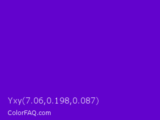 Yxy 7.06,0.198,0.087 Color is a normal violet color and the nearest color is French Violet #8806ce. Hex code #6203cd and RGB value is rgb(98,3,205). In RGB color space, this color is composed of 38% red, 1% green, 80% blue, In CMYK color space, this color is composed of 52% cyan, 99% magenta, 0% yellow , 20% black , In HSL color space, this color has a hue angle of 268° , 97% saturation and 41% lightness.