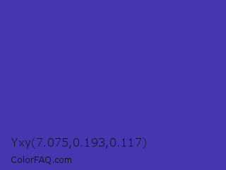 Yxy 7.075,0.193,0.117 Color is a normal indigo color and the nearest color is Ocean Blue #4f42b5. Hex code #4636b0 and RGB value is rgb(70,54,176). In RGB color space, this color is composed of 27% red, 21% green, 69% blue, In CMYK color space, this color is composed of 60% cyan, 69% magenta, 0% yellow , 31% black , In HSL color space, this color has a hue angle of 248° , 53% saturation and 45% lightness.