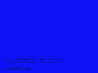Yxy 7.077,0.152,0.064 Color is a normal blue color and the nearest color is Bluebonnet #1c1cf0. Hex code #0c12f5 and RGB value is rgb(12,18,245). In RGB color space, this color is composed of 5% red, 7% green, 96% blue, In CMYK color space, this color is composed of 95% cyan, 93% magenta, 0% yellow , 4% black , In HSL color space, this color has a hue angle of 238° , 92% saturation and 50% lightness.