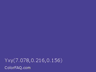 Yxy 7.078,0.216,0.156 Color is a normal indigo color and the nearest color is Dark Slate Blue #483d8b. Hex code #493f93 and RGB value is rgb(73,63,147). In RGB color space, this color is composed of 29% red, 25% green, 58% blue, In CMYK color space, this color is composed of 50% cyan, 57% magenta, 0% yellow , 42% black , In HSL color space, this color has a hue angle of 247° , 40% saturation and 41% lightness.