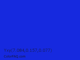 Yxy 7.084,0.157,0.077 Color is a normal blue color and the nearest color is Bluebonnet #1c1cf0. Hex code #1629df and RGB value is rgb(22,41,223). In RGB color space, this color is composed of 9% red, 16% green, 87% blue, In CMYK color space, this color is composed of 90% cyan, 82% magenta, 0% yellow , 13% black , In HSL color space, this color has a hue angle of 234° , 82% saturation and 48% lightness.