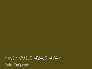 Yxy 7.091,0.424,0.474 Color is a very dark yellow color and the nearest color is Bronze Olive #4e420c. Hex code #544c10 and RGB value is rgb(84,76,16). In RGB color space, this color is composed of 33% red, 30% green, 6% blue, In CMYK color space, this color is composed of 0% cyan, 10% magenta, 81% yellow , 67% black , In HSL color space, this color has a hue angle of 53° , 68% saturation and 20% lightness.