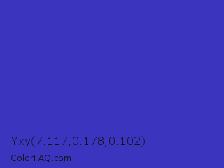 Yxy 7.117,0.178,0.102 Color is a normal indigo color and the nearest color is Governor Bay #2f3cb3. Hex code #3a34bf and RGB value is rgb(58,52,191). In RGB color space, this color is composed of 23% red, 20% green, 75% blue, In CMYK color space, this color is composed of 70% cyan, 73% magenta, 0% yellow , 25% black , In HSL color space, this color has a hue angle of 243° , 57% saturation and 48% lightness.