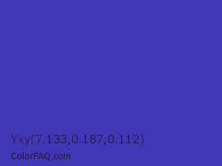 Yxy 7.133,0.187,0.112 Color is a normal indigo color and the nearest color is Ocean Blue #4f42b5. Hex code #4236b5 and RGB value is rgb(66,54,181). In RGB color space, this color is composed of 26% red, 21% green, 71% blue, In CMYK color space, this color is composed of 64% cyan, 70% magenta, 0% yellow , 29% black , In HSL color space, this color has a hue angle of 246° , 54% saturation and 46% lightness.