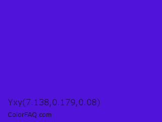 Yxy 7.138,0.179,0.08 Color is a normal indigo color and the nearest color is Interdimensional Blue #360ccc. Hex code #4f13d9 and RGB value is rgb(79,19,217). In RGB color space, this color is composed of 31% red, 7% green, 85% blue, In CMYK color space, this color is composed of 64% cyan, 91% magenta, 0% yellow , 15% black , In HSL color space, this color has a hue angle of 258° , 84% saturation and 46% lightness.