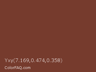 Yxy 7.169,0.474,0.358 Color is a normal red color and the nearest color is Nutmeg #81422c. Hex code #763b2d and RGB value is rgb(118,59,45). In RGB color space, this color is composed of 46% red, 23% green, 18% blue, In CMYK color space, this color is composed of 0% cyan, 50% magenta, 62% yellow , 54% black , In HSL color space, this color has a hue angle of 12° , 45% saturation and 32% lightness.